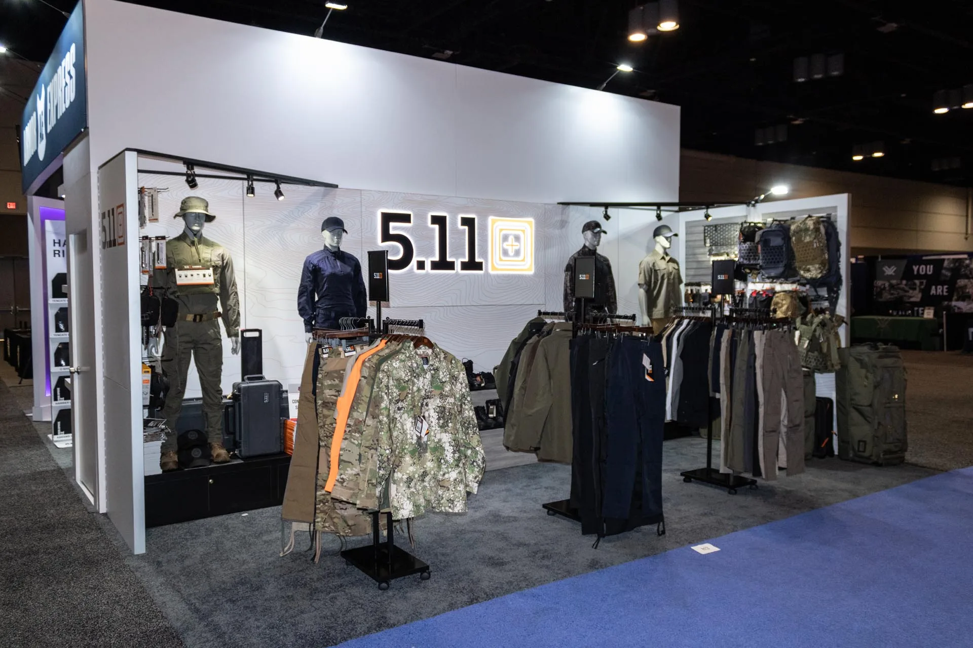 5.11 is one of West Coast Exhibits top customers. Specializing in different types of gear ranging from cargo pants to carrying cases, 5.11 has it all. It was West Coast Exhibits goal to create a booth that wasn't necessarily large, but showcased product extremely well to catch the eye of the potential customers walking by the booth. This custom fabricated booth featured custom signage built by West Coast as well as product display stands and hangars to hang some of the clothing they offered.